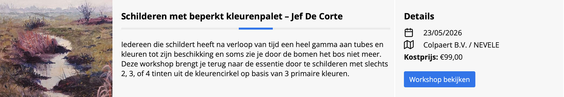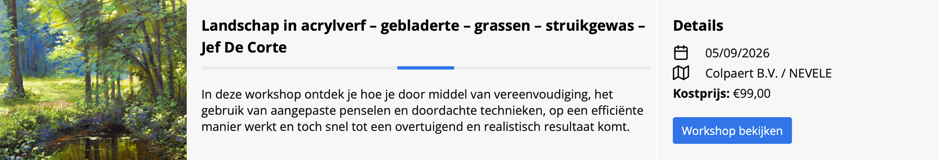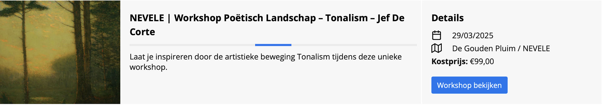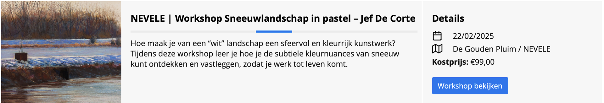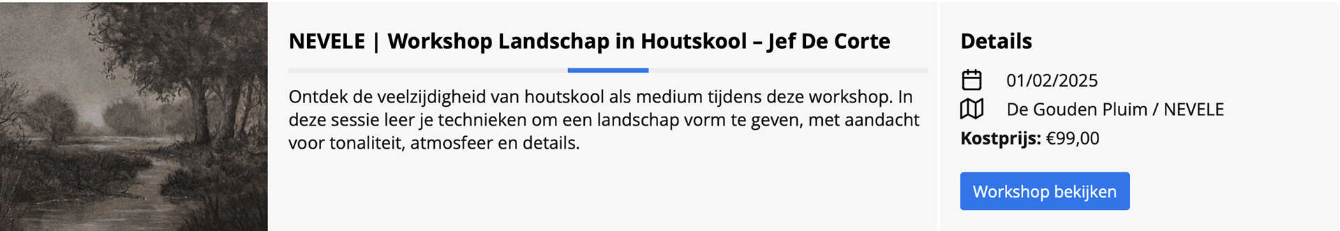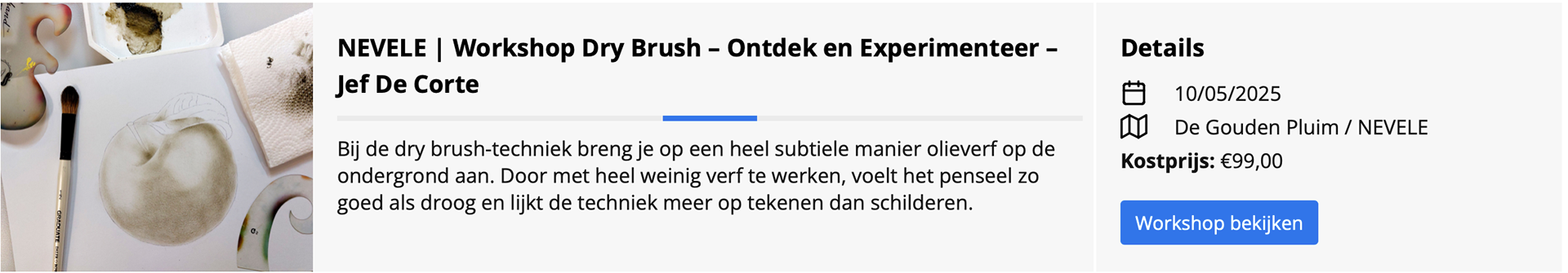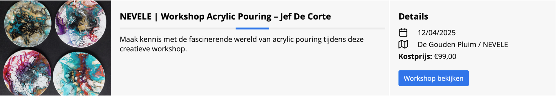Hieronder vind je informatie over geplande workshops bij De Gouden Pluim (Nevele) en Den Atelier (Aalst).